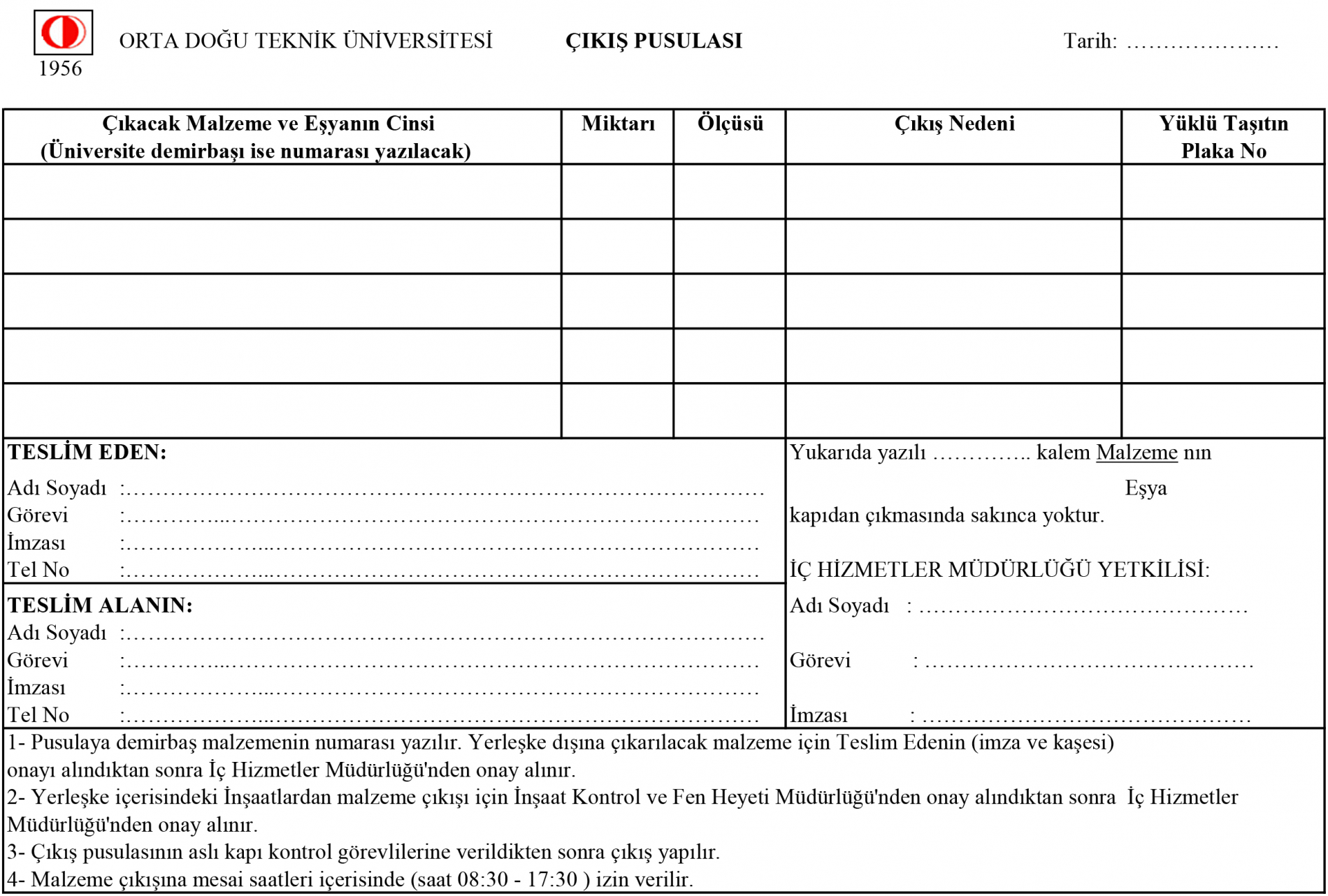 Malzeme çıkışına mesai saatleri içerisinde (saat 08:30 - 17:30) izin verilir.